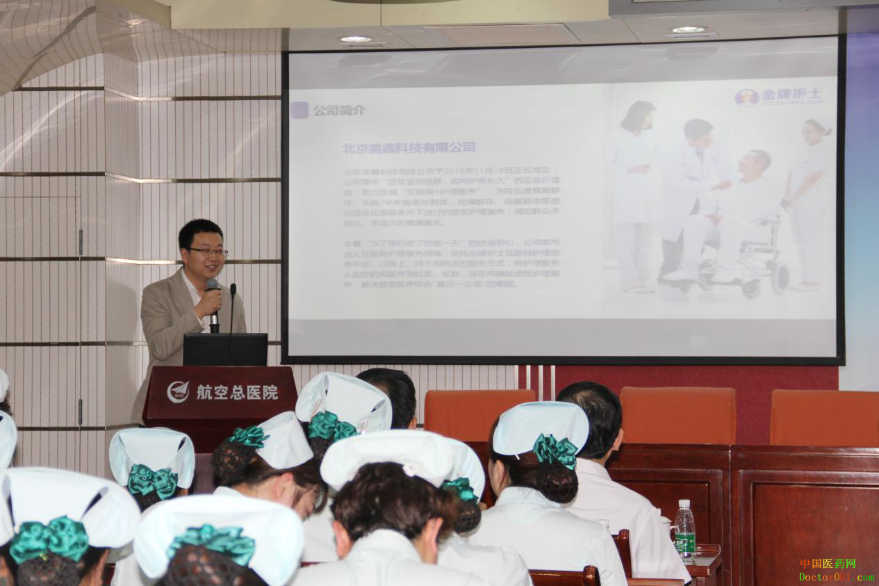 图:北京市卫生健康委医政医管处副处长刘颖致辞 据悉,北京美鑫科技有限公司作为互联网护理服务领域的领先企业,拥有互联网护理信息平台——金牌护士APP,并建设有多家以“护士上门、医养结合”为服务特色的美鑫医疗连锁护理站,旨在利用互联网技术发展居家护理和健康管理服务。自国家卫健委发布《“互联网+护理服务”试点工作方案》以来,北京美鑫科技有限公司多次受到北京市卫健委、朝阳区卫健委和各级医院领导的考察及调研,其在“互联网+护理服务”领域的工作开展更获得了来自政府、行业协会、医疗机构、护士、客户等多方面的肯定。 在国家卫健委鼓励医疗机构利用在本机构注册的护士,依托互联网等信息技术,以“线上申请、线下服务”的模式,为出院患者或罹患疾病且行动不便的特殊人群提供护理服务的背景下。中国医科大学航空总医院作为集医疗、教学、科研、预防为一体的三级综合医院,更是率先迈出了发展“互联网+护理服务”实质性的一步。