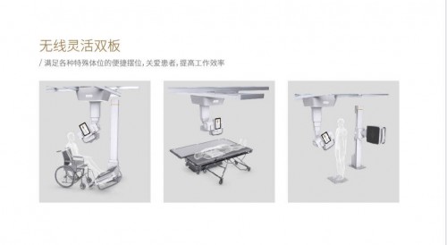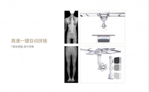 配备17×17吋无线双平板,实现大范围覆盖,满足担架位、轮椅位等各种特殊体位的离床摄影,方便医生为特殊紧急情况的患者施展快速及时的检查。快捷的一键自动拼接功能,以更低剂量和更快速度实现完美图像拼接。 AI智能诊断功能,助力快速筛查和诊断