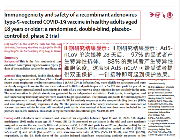 (陈薇院士实验室照片) 重组腺病毒载体新冠疫苗(Ad5-nCoV)采用的是腺病毒载体技术,凭借这个技术,康希诺生物与军事科学院陈薇院士团队曾于2017年成功研发重组埃博拉病毒病疫苗(Ad5-EBOV),因此,腺病毒载体技术是一种已被验证过的安全有效的技术平台。 作为一款基因工程疫苗,除上述安全性之外,这款疫苗的优势是它能够同时诱导体液免疫和细胞免疫。如果把免疫应答的过程比喻成免疫系统与外来敌人的战争,那么,这款疫苗所诱发的免疫应答,相当于海陆空联合作战彻底消灭敌人,免疫原性自然更好。而基于不同技术路线的新冠候选疫苗的免疫学原理,并不是所有的疫苗都能够激发细胞免疫。 那这款疫苗是如何工作的呢? 简言之,腺病毒载体新冠疫苗(Ad5-nCoV)是把新冠病毒S蛋白的基因构建到腺病毒基因组。外壳仍然是腺病毒的正常外壳蛋白,但里面的基因却含有编码新冠病毒S蛋白的基因。因此,腺病毒侵染宿主细胞的时候,把编码新冠病毒S蛋白的基因都释放到宿主细胞,在细胞质中合成S蛋白,由S蛋白激发一系列的免疫反应。 该疫苗II期临床试验结果显示,单次接种腺病毒载体新冠疫苗28天后,97%的受试者产生特异性抗体,88%的受试者产生特异性细胞免疫。这表明,该疫苗可给受试者提供双重保护,一针接种即可起到保护作用。