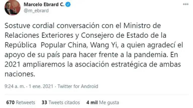 2021年1月3日,《人民日报》官微发文“感谢中国”,墨西哥外长埃布拉德在社交媒体上表示,感谢中华人民共和国在对抗新冠肺炎疫情方面给予墨西哥的大力支持;墨西哥总统洛佩斯日前称赞康希诺(新冠)疫苗的有效性和便携性将给墨西哥老年人和居住在偏远地区的居民带来希望。