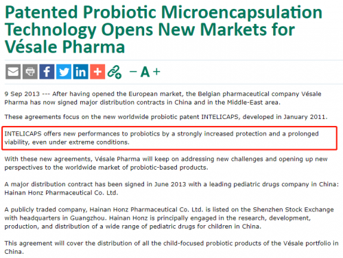 微囊化技术(Intelicaps ®)相关报道 这项技术对于保持益生菌抵达人体肠胃时的活性有着重要作用。联合国粮农组织/世界卫生组织联合专家委员会提出了益生菌的科学定义:益生菌系指活的微生物,当摄取足够数量时,对宿主健康有益。[2]消费者在挑选益生菌产品时,也会对益生菌产品到达肠胃时的活性异常关注。作为Cinfa的核心技术,“微囊包埋技术“能够利用天然或合成的高分子成膜材料,把液体或者固体药物包嵌形成直径1-5000um微小胶囊,从而保护有效成分,使得益生菌能够在人体内发挥足够的功效。
