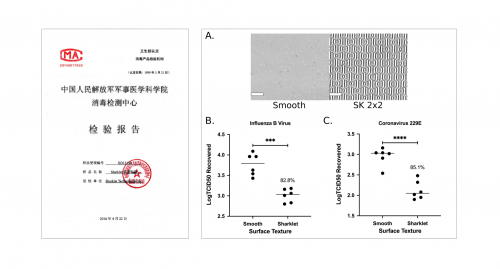 早在 2016 年,中国人民解放军军事科学医学院消毒检测中心(中国人民解放军的最高医学研究机构)就对 Sharklet 鲨纹物理抗菌手套同样材质的抗菌膜片进行检测。实验结果证明 Sharklet 鲨纹物理抗菌技术对大肠杆菌的表面接触污染下降率为 94%;对金葡球菌的表面接触污染下降率为 95%;绿脓杆菌的表面接触污染下降率为 95%。 不仅如此,Sharklet 鲨纹科研人员在 2021 年最新发表的学术论文中,也证实了 Sharklet 鲨纹物理抗菌技术对流感病毒和冠状病毒 229E 的表面接触污染也有 80% 以上的控制作用。