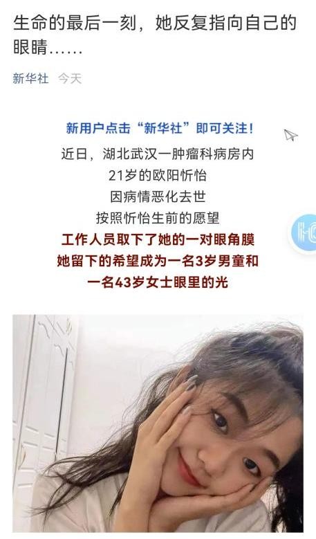 10月,湖北武汉一肿瘤科病房内,21岁的欧阳忻怡因病情恶化心脏停止跳动。遵照忻怡生前遗愿,工作人员摘取了她的一对眼角膜,欧阳忻怡的眼角膜,由武汉市红十字会普瑞眼角膜库接收,在武汉普瑞眼科医院刘红山教授及徐静医生的帮助下,成功为一位3岁男童及43岁女士带来光明,完成了她临终前的心愿。