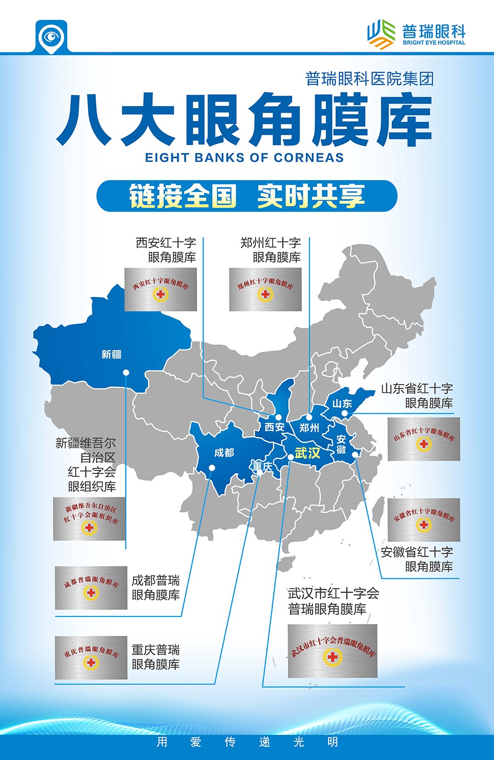 武汉普瑞眼科医院业务院长兼眼角膜库主任张晓农介绍,普瑞眼科是全国连锁的眼科医院,目前在全国19个城市设立22家眼科专科医院;为大力发展眼角膜光明事业,秉承“用爱传递光明”的建院理念,目前已在全国成功设立8家眼角膜库,分别在安徽合肥、湖北武汉、四川成都、陕西西安、重庆、新疆乌鲁木齐、河南郑州、山东济南8个城市,眼角膜库中心专门用于眼角膜捐献、采集、储存和移植、科研,并将这些爱心供体运用到渴求光明的患者身上。