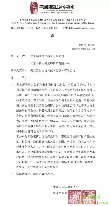 ![]() 美亚生物科技集团发现“北京瑞伽医疗科技有限公司”、“北京军科正昊生物科技有限公司”两家公司,冒用美亚李政道博士名义从事宣传活动。经李政道博士本人确认,该活动为李博士受友人之邀,事前不知情,而会后基于友谊配合摄影。岂知该两家公司却以李博士与上述公司有所合作,甚且使用美亚集团网站、微信的文字及照片进行宣传,已然有剽窃抄袭、侵犯本公司和李政道博士权益的实际行为,李博士为此连系从中介绍友人,该友人深感抱歉,并表示该仿冒公司董事长将来美亚公司登门道歉,惟迄今未见行动,本集团不得已将委托律师对之采取法律行动。 在此郑重声明,李政道博士所有技术及姓名权、肖像权,均已独家技术入股本集团,李博士并为美亚创办人之一。上述两家公司的任何产品项目与科研完全与美亚集团或李政道博士无关,该两公司侵害本集团及李政道博士权益的种种行为,迄今不道歉及赔偿,本集团将严肃追究,以警不法。请关心美亚的所有朋友们直接和本集团联系,以免因不实宣传遭受不必要的损失。 ![]() ▲ ﻪ针对此次事件美亚生物科技集团已发律师函: ![]() ▲如下内容为美亚生物集团总裁吴宜蓁女士与美亚李政道博士微信对话内容: ![]() ▲如下内容为此次侵权行为,详细内容举证比对: ![]() ![]() 长期以来,多家公司曾冒用美亚“血清干细胞之父”李政道博士的名义进行虚假宣传,本公司也曾就此类新闻严正打假声明过,但此类虚假信息仍层出不穷,故本公司再次呼吁业界同行,请秉持职业操守,遵守行业规则、本着科学首重求真,脚踏实地推进干细胞产业发展,推动大健康产业前行。 (责任编辑:美亚生物) (责任编辑:Doctor001) |