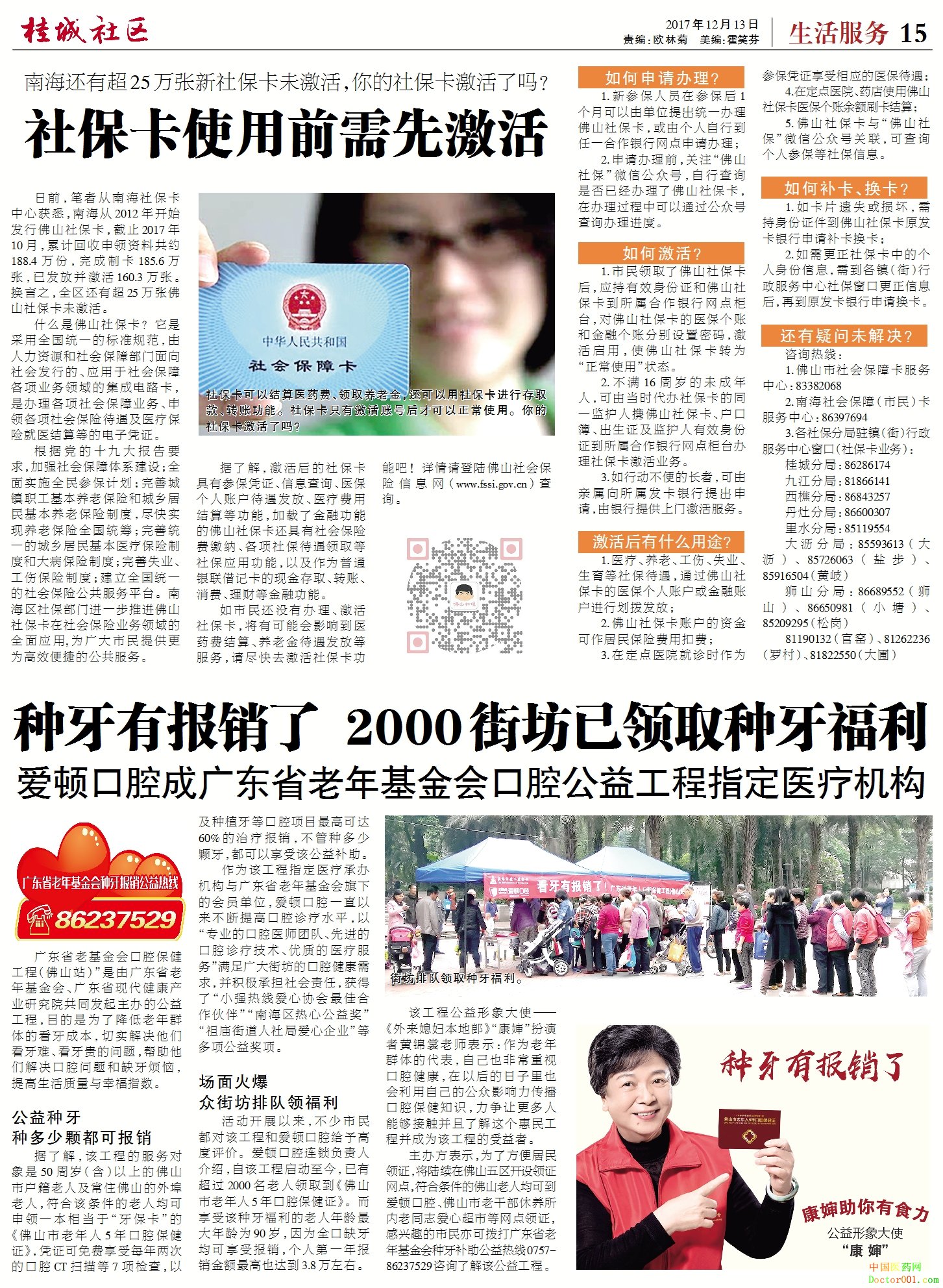 据主办方介绍:本次公益工程将进行严格按照“申报—审核—发证—激活—使用(种牙) ”的流程审核,市民领证后,需要激活《佛山市老年人5年口腔保健证》方能使用。为了保证服务质量,让每个参与的客户得到周到、高效的服务,自该公益活动启动以来,广大市民踊跃参与,到目前为止受惠老人已超过4000人,该活动已为1000名老人成功种牙,其中年龄在80岁以上的高龄人群有200人。并为69例疑难病例解决了牙槽骨缺失、骨质疏松等种植牙难题。据主办方介绍:50周岁(含)以上的佛山市户籍老人及常住佛山的外埠老人均可参与该公益种牙活动,申领由广东省老基金会颁发的《佛山市老年人5年口腔保健证》一本,凭证可免费享受口腔CT扫描等7项检查及种植牙等高达60%的报销。