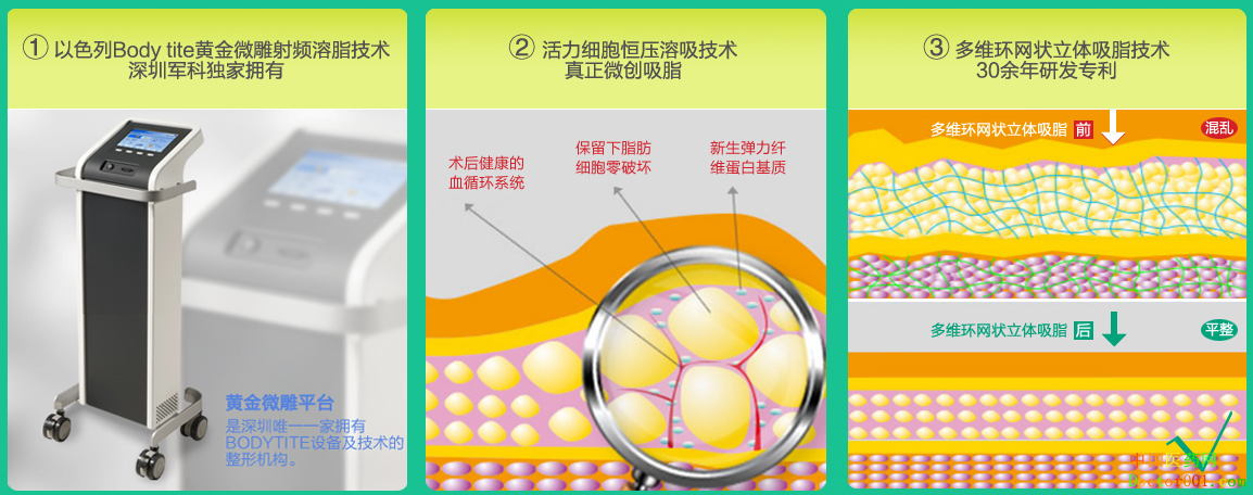 ¡¡¡¡ÉîÛÚ¾ü¿Æ×ÔÌåÖ¬·¾ÒÆÖ²ÖÐÐÄר¼ÒÍŶÓÑо¿¶àÄ꣬¶À¼ÒÑз¢Á½¼¶·Ö²ã³éÖ¬¼¼Êõ£¬ÈÚ»ã»îÁ¦Ï¸°ûºãѹÈÜÎü¼¼ÊõºÍÒÔÉ«ÁÐBodytite»Æ½ð΢µñÉ䯵ÈÜÖ¬¼¼ÊõµÈ¶àÏîÎüÖ¬ºËÐļ¼Êõ£¬Õë¶ÔÊõÖи÷¸ö»·½Ú½øÐÐ72Ïîϸ½Ú°Ñ¿Ø£¬ÈÚ»ã¸ß±¶Ï¸·ÖƤÏÂÖ¬·¾×éÖ¯½á¹¹ÀíÄÓÐЧ±Ü¿ªÖ¬·¾³éÈ¡²¿Î»µÄÉñ¾×éÖ¯ºÍѪ¹Ü£¬¾«×¼·ÖÎöÉíÌå¸÷¸ö²¿Î»Ö¬·¾¶Ñ»ýÁ¿£¬Íø¸ñ»¯ÎüÖ¬ÇøÓò£¬¾ùºâ·ÖÀë³öµÚ¶þ¡¢µÚÈýÖ¬·¾²ã¶àÓàÖ¬·¾Ï¸°û£¬ÊõºóƤ·ôƽÕû½ôÖ£¬ÐÎÌåÇúÏß×ÔÈ»Á÷³©¡£