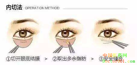 经下眼结膜囊内小切口(点状),将眼部脂肪祛除。因而皮肤表面无任何切口,主要适用于单纯眶隔脂肪膨出、下睑皮肤弹性较好的年轻人,不适用于皮肤、眼轮匝肌、眶隔膜明显松弛的中重度眼袋。 优点:组织损伤小,出血少,皮肤无切口,术后无显露性瘢痕。
