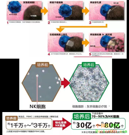(NK细胞(黄色)识别并杀死癌细胞(粉红色)或病毒感染的细胞) 它们被命名为“自然杀手”细胞,因为与T细胞不同,它们直接检测并摧毁受感染和恶性细胞,而不必被激活或“训练”以对癌细胞作出反应。T细胞需要将其靶细胞的一些部分“呈现”给其他免疫细胞,以将它们识别为外来细胞,并使T细胞聚集成攻击模式。然而,现在已经知道NK细胞通过暴露于称为细胞因子的免疫系统物质而被激活时表现更好。 尽管他们可以迅速进行防御并直接攻击肿瘤细胞,但NK细胞只是免疫系统的一小部分,仅占白细胞的10%。癌症患者自身的NK细胞数量减少,并且在移除时不能非常有效地发挥作用并作为细胞疗法的形式回输给患者。这就是为什么研究人员现在专注于同种异体“过继性”NK细胞疗法 -从密切相关的供体收集NK细胞并将其注入患者体内。这已被证明是安全的,并且与T细胞疗法不同,NK细胞不会对受体组织造成移植物抗宿主病。 NK细胞作为机体固有免疫系统中重要的组成部分,在肿瘤免疫方面发挥重要作用。NK细胞表面活化受体和抑制受体的表达决定其抗肿瘤能力的强弱。然而,它在人体内存在的量很少,人类到了25岁以后,免疫力下降,NK细胞数量变得更少,肿瘤患者及肿瘤术后患者体内NK细胞的数量及活性都发生了一定的改变。因此,如何提高体内NK细胞的数量成为激活自己免疫战胜癌症的关键。 Ÿ研究人员正在研究增强NK细胞杀癌能力的方法! 这项发现,为癌症患者的免疫治疗提供了一个全新的选择。未来,临床医师或许可以通过免疫检查点抑制剂,联合靶向NK细胞的免疫疗法,对当前许多束手无策的肿瘤类型进行治疗! 自从1975年发现NK细胞后,研究人员通过在体外做很多实验,验证了NK细胞的活性很高,对细菌、肿瘤有很好的清除作用。为了提高体内NK细胞的活性及数量,日本的科学家发明了一种亿万倍增法,是从人体血液当中抽取50ml,把极少量的NK细胞分离出来再扩增培养,使其数量增加到原来的1000倍,数量达到10亿-50亿个,再回输体内,大量的NK细胞会随着血液全身循环3000次到4000次,把体内的癌细胞,老化细胞,病变细胞,细菌病毒等杀灭一遍,从而达到防癌抗癌,提升免疫力,延长生存期的目的。