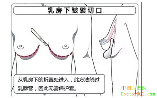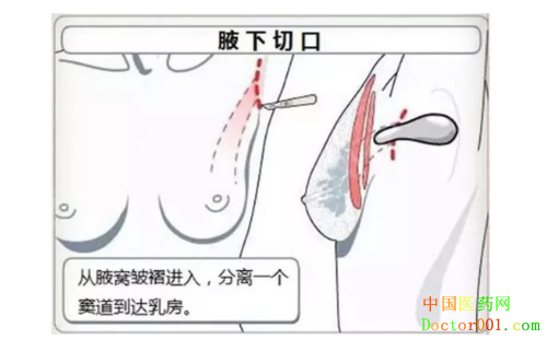 ▲ 腋窝切口示意图 优点:腋窝切口位置比较隐蔽,手术后后疤痕不明显。不易损伤重要的血管、神经。 缺点:腋窝切口离乳房还是比较远,手术的时候需要剥离的范围比较大,对医生的经验和技术要求也比较高。手术后胳膊活动会有一些限制。 C 乳房下皱襞切口