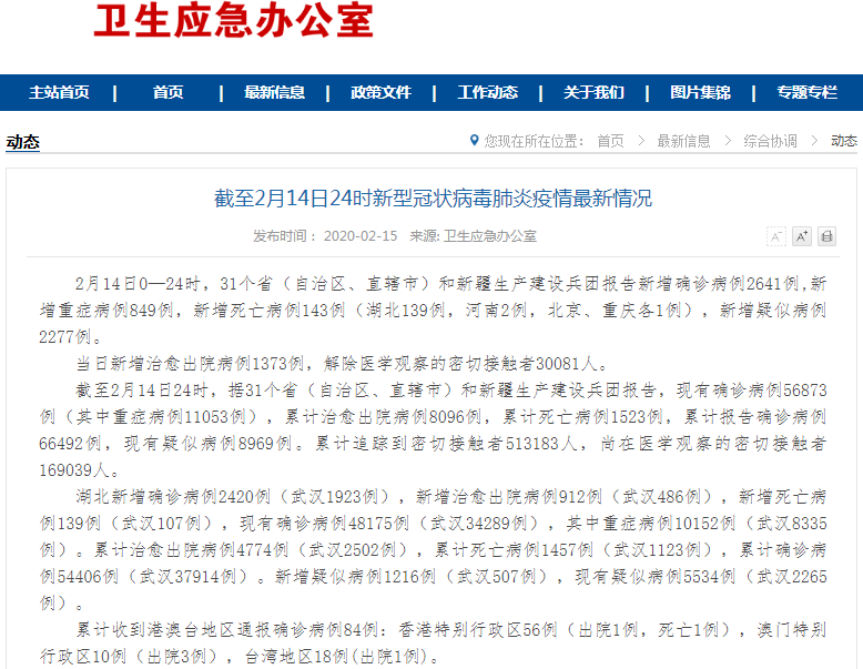 2月14日0—24时,31个省(自治区、直辖市)和新疆生产建设兵团报告新增确诊病例2641例,新增重症病例849例,新增死亡病例143例(湖北139例,河南2例,北京、重庆各1例),新增疑似病例2277例。 当日新增治愈出院病例1373例,解除医学观察的密切接触者30081人。 ![]() 截至2月14日24时,据31个省(自治区、直辖市)和新疆生产建设兵团报告,现有确诊病例56873例(其中重症病例11053例),累计治愈出院病例8096例,累计死亡病例1523例,累计报告确诊病例66492例,现有疑似病例8969例。累计追踪到密切接触者513183人,尚在医学观察的密切接触者169039人。 湖北新增确诊病例2420例(武汉1923例),新增治愈出院病例912例(武汉486例),新增死亡病例139例(武汉107例),现有确诊病例48175例(武汉34289例),其中重症病例10152例(武汉8335例)。累计治愈出院病例4774例(武汉2502例),累计死亡病例1457例(武汉1123例),累计确诊病例54406例(武汉37914例)。新增疑似病例1216例(武汉507例),现有疑似病例5534例(武汉2265例)。 累计收到港澳台地区通报确诊病例84例:香港特别行政区56例(出院1例,死亡1例),澳门特别行政区10例(出院3例),台湾地区18例(出院1例)。 (责任编辑:Doctor001) |