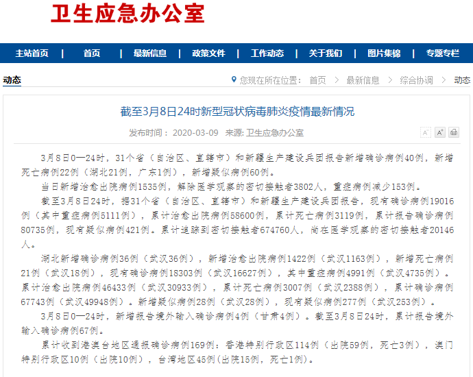 3月8日0—24时,31个省(自治区、直辖市)和新疆生产建设兵团报告新增确诊病例40例,新增死亡病例22例(湖北21例,广东1例),新增疑似病例60例。 当日新增治愈出院病例1535例,解除医学观察的密切接触者3802人,重症病例减少153例。 ![]() 截至3月8日24时,据31个省(自治区、直辖市)和新疆生产建设兵团报告,现有确诊病例19016例(其中重症病例5111例),累计治愈出院病例58600例,累计死亡病例3119例,累计报告确诊病例80735例,现有疑似病例421例。累计追踪到密切接触者674760人,尚在医学观察的密切接触者20146人。 湖北新增确诊病例36例(武汉36例),新增治愈出院病例1422例(武汉1163例),新增死亡病例21例(武汉18例),现有确诊病例18303例(武汉16627例),其中重症病例4991例(武汉4735例)。累计治愈出院病例46433例(武汉30933例),累计死亡病例3007例(武汉2388例),累计确诊病例67743例(武汉49948例)。新增疑似病例28例(武汉28例),现有疑似病例277例(武汉253例)。 3月8日0—24时,新增报告境外输入确诊病例4例(甘肃4例)。截至3月8日24时,累计报告境外输入确诊病例67例。 累计收到港澳台地区通报确诊病例169例:香港特别行政区114例(出院59例,死亡3例),澳门特别行政区10例(出院10例),台湾地区45例(出院15例,死亡1例)。 (责任编辑:Doctor001) |