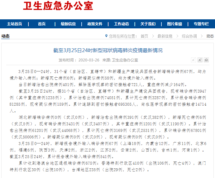3月25日0—24时,31个省(自治区、直辖市)和新疆生产建设兵团报告新增确诊病例67例,均为境外输入病例;新增死亡病例6例;新增疑似病例58例,均为境外输入病例。 当日新增治愈出院病例401例,解除医学观察的密切接触者721人,重症病例减少164例。 ![]() 截至3月25日24时,据31个省(自治区、直辖市)和新疆生产建设兵团报告,现有确诊病例3947例(其中重症病例1235例),累计治愈出院病例74051例,累计死亡病例3287例,累计报告确诊病例81285例,现有疑似病例159例。累计追踪到密切接触者695305人,尚在医学观察的密切接触者14714人。 湖北新增确诊病例0例(武汉0例),新增治愈出院病例391例(武汉382例),新增死亡病例6例(武汉5例),现有确诊病例3431例(武汉3407例),其中重症病例1201例(武汉1195例)。累计治愈出院病例61201例(武汉44068例),累计死亡病例3169例(武汉2531例),累计确诊病例67801例(武汉50006例)。新增疑似病例0例(武汉0例),现有疑似病例0例(武汉0例)。 3月25日0—24时,新增报告境外输入确诊病例67例(上海18例,内蒙古12例,广东11例,北京6例,福建6例,陕西3例,天津2例,浙江2例,江苏2例,云南2例,山西1例,吉林1例,河南1例)。截至3月25日24时,累计报告境外输入确诊病例541例。 累计收到港澳台地区通报确诊病例675例:香港特别行政区410例(出院106例,死亡4例),澳门特别行政区30例(出院10例),台湾地区235例(出院29例,死亡2例)。 (责任编辑:Doctor001) |