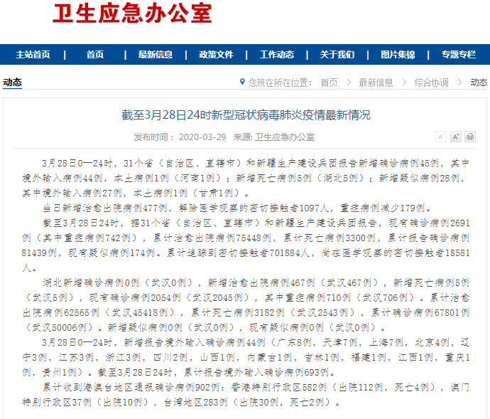 3月28日0—24时,31个省(自治区、直辖市)和新疆生产建设兵团报告新增确诊病例45例,其中境外输入病例44例,本土病例1例(河南1例);新增死亡病例5例(湖北5例);新增疑似病例28例,其中境外输入病例27例,本土病例1例(甘肃1例)。 当日新增治愈出院病例477例,解除医学观察的密切接触者1097人,重症病例减少179例。 ![]() 截至3月28日24时,据31个省(自治区、直辖市)和新疆生产建设兵团报告,现有确诊病例2691例(其中重症病例742例),累计治愈出院病例75448例,累计死亡病例3300例,累计报告确诊病例81439例,现有疑似病例174例。累计追踪到密切接触者701884人,尚在医学观察的密切接触者18581人。 湖北新增确诊病例0例(武汉0例),新增治愈出院病例467例(武汉467例),新增死亡病例5例(武汉5例),现有确诊病例2054例(武汉2045例),其中重症病例710例(武汉706例)。累计治愈出院病例62565例(武汉45418例),累计死亡病例3182例(武汉2543例),累计确诊病例67801例(武汉50006例)。新增疑似病例0例(武汉0例),现有疑似病例0例(武汉0例)。 3月28日0—24时,新增报告境外输入确诊病例44例(广东8例,天津7例,上海7例,北京4例,辽宁3例,江苏3例,浙江3例,四川2例,山西1例,内蒙古1例,吉林1例,福建1例,江西1例,重庆1例,贵州1例)。截至3月28日24时,累计报告境外输入确诊病例693例。 累计收到港澳台地区通报确诊病例902例:香港特别行政区582例(出院112例,死亡4例),澳门特别行政区37例(出院10例),台湾地区283例(出院30例,死亡2例)。 (责任编辑:Doctor001) |