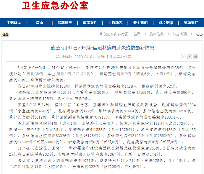 3月31日0—24时,31个省(自治区、直辖市)和新疆生产建设兵团报告新增确诊病例36例,其中境外输入病例35例,本土病例1例(广东1例);新增死亡病例7例(湖北6例,上海1例);新增疑似病例26例,均为境外输入病例。 当日新增治愈出院病例186例,解除医学观察的密切接触者1418人,重症病例减少62例。 ![]() 境外输入现有确诊病例691例(含重症病例20例),现有疑似病例169例。累计确诊病例806例,累计治愈出院病例115例,累计死亡病例0例。 截至3月31日24时,据31个省(自治区、直辖市)和新疆生产建设兵团报告,现有确诊病例2004例(含重症病例466例),现有疑似病例172例。累计确诊病例81554例,累计治愈出院病例76238例,累计死亡病例3312例,累计追踪到密切接触者707913人,尚在医学观察的密切接触者20314人。 湖北新增确诊病例1例(武汉1例,为境外输入病例),新增治愈出院病例173例(武汉173例),新增死亡病例6例(武汉5例),现有确诊病例1283例(武汉1279例),其中重症病例435例(武汉432例)。累计治愈出院病例63326例(武汉46175例),累计死亡病例3193例(武汉2553例),累计确诊病例67802例(武汉50007例)。新增疑似病例0例(武汉0例),现有疑似病例0例(武汉0例)。 31个省(自治区、直辖市)和新疆生产建设兵团报告新增无症状感染者130例,当日转为确诊病例2例,当日解除隔离302例。尚在医学观察无症状感染者1367例,比前一日减少174例。 累计收到港澳台地区通报确诊病例1077例:香港特别行政区714例(出院128例,死亡4例),澳门特别行政区41例(出院10例),台湾地区322例(出院39例,死亡5例)。 (责任编辑:Doctor001) |