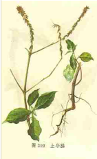 【标题】 土牛膝 【拼音】 Tǔ Niú Xī 【异名】 杜牛膝(《本草备要》)。 【性味】 苦酸,平。 ①《福建民间草药》:"苦酸,平,无毒。" ②《广西中草药》:"味微苦酸,性寒,无毒。" ③《云南中草药》:"甘微酸,凉。" 【功效】 活血散瘀,祛湿利民,清热解毒。治淋病,尿血,妇女经闭,症瘕,风湿关节痛,脚气,水肿,痢疾,疟疾,白喉,痈肿,跌打损伤。 ①《本草图经》:"治妇人血块。" ②《纲目拾遗》:"活血化瘀,宽筋,理跌打损伤。治破伤风,七十二般恶疾。功胜川产。又:善能理疮,并箭入肉。" ③《岭南采药录》:"为收敛药及利小便药,清血消毒。治喉症捣汁含漱;又散血止痛,理脚气,煎酒服。" ④《福建民间草药》:"散瘀血,强足膝,引药下行。" ⑤《南宁市药物志,:"清热,散血止痛。治疟疾、痔疮及红白痢;外用治跌打损伤。" ⑥《江西草药》:"治竹木刺伤,毒蜂咬伤等症;并可引产。" ⑦《上海常用中草药手册》:"通经利尿,清热解毒,活血止痛。治脚气肿胀,关节炎,风湿痛,白喉,急慢性咽炎。" ⑧《贵州草药》:"生用可破血利湿,炒用补肝肾,强筋骨。" ⑨《云南中草药》:"活血祛瘀,清热除湿,治咳血,鼻衄,尿血,尿路感染,湿热带下。" 【药用】 为苋科植物牛膝的野生种及柳叶牛膝、粗毛牛膝等的根和根茎。冬春间或秋季采挖,除去茎叶及须根,洗净,晒干或用硫黄熏后晒干。 【应用】 ①治疗白喉 取煎液内服,或药汁喷雾,均有效果。㈠内服:用新鲜根1斤,制成浓缩煎液500毫升。10岁以内小儿每日100毫升,分3~4次服。治疗咽白喉29例,气管白喉3例,除2例分别因突然窒息、严重中毒而致心肌麻痹死亡外,均获治愈,治愈病例服药时间平均为6.8天,呼吸困难于2~8日恢复正常,咽头伪膜于2~7日脱落,体温于2~10天下降,细菌培养4~8日转阴。㈡喷雾:用新鲜土牛膝根捣烂,加入30~40℃左右的温开水浸渍24小时,过滤取汁。以喉头喷雾器装入新鲜药汁,每隔2小时喷射1次,连续使用,直至伪膜剥离为止。据35例的初步观察,约有半数以上的病例,伪膜在治疗后第4天完全脱落,最快的为17小时,但也有延长至15日之久的。喷射次数与剥离速度似无明显关系。随着伪膜的消退,全身症状也远渐消失或减轻。此外,有用鲜土牛膝全草5~7棵捣烂绞汁,兑入人乳或冷开水半杯,每10~20分钟取少许吞咽,或从鼻孔中滴入,使药物作用于咽喉部。治疗2例,均在4~S天痊愈。 ②治疗小儿肺炎 用新鲜土牛膝根1斤捣烂,加入适量开水,绞取汁1斤,隔水蒸半小时。1~2岁每次服15毫升,3~5岁20~26毫升,每隔4~6小时1次。治疗麻疹并发肺炎、支气管肺炎、流感肺炎等26例(其中7例曾配合其它中药治疗),服药1~6天(平均2.6天)后,24例痊愈,2例死亡。 ③引产 取新鲜土牛膝根(须选白色的,红色的无效)2寸左右长,洗净,刮去粗皮,一端削成圆锥状,尾部扎丝线1根,用高压或75%酒精浸泡消毒。外阴及宫颈口按常规消毒后,将土牛膝根轻轻插入宫颈,再以消毒纱布塞入阴道,以防牛膝脱出。亦可用鲜土牛膝5克捣烂取汁,以消毒纱布浸湿,卷成条状,用无菌塑料纸包好,针刺若干小孔(便于药汁渗出),然后按上法插入宫颈内。一般12~24小时内即可发生效果。土牛膝根待流产时自行排出。如24小时仍未生效,应取出,另取新鲜者插入。据18例的观察,结果11例成功,1例不全流产。又用于过期流产4例(其中死胎2例)和大月份的葡萄胎2例,亦获良效。药物反应有轻度体温升高,流产后即可降至正常。但使用时必须严格消毒,注意操作,防止感染及宫颈外伤。 【注意】 《福建民间草药》:"孕妇忌用。" 【用法用量】 内服:煎汤,3~5钱(鲜者1~2两)。外用:捣敷,捣汁滴耳或研末吹喉。 【形态】 ①牛膝,详"牛膝"条。 ②柳叶牛膝,又名:山牛膝(《纲目拾遗》),剪刀牛膝。 多年生草本,高1~1.6米.茎直立,四方形,节膨大;叶对生,叶片披针形或狭披针形,长约4.5~15厘米,宽约0.5~3.6厘米,先端及基部均渐尖,全缘,上面绿色,下面常呈紫红色。穗状花序腋生或顶生;花多数;苞片1,先端有齿;小苞片2,刺状,紫红色,基部两侧各有1卵圆形小裂片,长约0.6毫米;花被5,绿色,线形,具3脉;雄蕊5,花丝下部合生,退化雄蕊方形,先端具不明显的齿;花柱长约2毫米。胞果长卵形。花期7~10月。果期3~11月。 分布湖南、湖北、四川、云南、贵州、江西、安徽、江苏、浙江、福建等地。 ③粗毛牛膝,详"倒扣草"条。 【炮制】 拣去杂质,洗净,润透切段,晒干。 【性状】 ①牛膝(野生者)的干燥根茎及根,又名:野牛膝。根茎呈圆柱状,长1~3厘米,直径6~10毫米,灰棕色,上端有茎基残留,周围着生多数粗细不一的根。根长圆柱形,略弯曲,长约15厘米以下,径可达4毫米;表面淡灰棕色,有细密的纵皱纹。质稍柔软,干透后易折断,断面黄棕色,可见成圈状散列的维管束。气微,味微甜。 产陕西、甘肃、安徽、江西、福建、浙江、江苏、四川、贵州等地。 ②柳叶牛膝的干燥根茎及根,又名:苏木红、荔支红、透血红(《纲目拾遗》),红牛膝、牛克膝。根茎短粗,长2~6厘米,径1~1.5厘米。根4~9条,扭曲,长10~20厘米,径0.4~1.2厘米,向下渐细。表面灰黄褐色,具细密的纵皱纹及须根除去后的痕迹。质硬而稍有弹性,易折断,断面皮部淡灰褐色,略光亮,可见多数点状散布的维管束。气微,味初微甜后涩。 产江西、浙江、湖北、湖南、四川、贵州等地。 ③粗毛牛膝的干燥根茎及根。根茎短圆柱形,灰棕色,周围着生众多圆柱状细长的根,长约6~10余厘米,粗约2~5毫米,略弯曲。表面灰棕色,有细浅