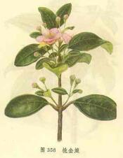 【标题】 桃金娘 【拼音】 Táo Jīn Niánɡ 【拉丁文】 Rhodomyrtus tomentosa (Ait.) Hassk. [Myrtus tomentosa Ait.] 【异名】 金丝桃、山稔子、山菍、多莲、豆稔干、稔果、多奶、山多奶、苏园子、石榴子、白碾子、岗稔、水刀莲、乌肚子、当梨子、哆哞仔、稔子 【性味】 味甘;涩;性平 【归经】 归肝;脾经 【功效】 养血止血;涩肠固精。主血虚体弱;吐血;鼻衄;劳伤咳血;便血;崩漏;遗精;带下;痢疾;脱肛;烫伤;外伤出血 【药用】 为桃金娘科植物桃金娘的果实。 【注意】 大便秘结者禁服。 《台湾药用植物志》:“儿童食之,或大便难下。” 【用法用量】 内服:煎汤,6-15g,鲜品15-30g;或浸酒。外用:适量,烧存性研末调敷。 【形态】 灌木,高1-2m。嫩枝有灰白色柔毛。叶对生;叶柄长4-7mm;叶片革质,椭圆形或倒卵形,长3-8cm,宽1-4cm,先端圆或钝,常微凹入,有时稍尖,基部阔楔形,上面初时有毛,以后变无毛,发亮,下面有灰色茸毛,全缘;离基3出脉,直达先端且相结合。花单生,紫红色,直径2-4cm,有长梗;萼管倒卵形,长6mm,有灰茸毛,裂片5,近圆形,长4-5mm,宿存;花瓣5,倒卵形,长1.3-2cm;雄蕊红色,多数,长7-8mm,花药纵裂;子房下位,3室,花柱长1m,柱头扩大。浆果卵状壶形,长1.5-2cm,宽1-1.5cm,熟时紫黑色;种子多数,每室2列。花期4-5月,果期7-9月。 【生态环境】 生于丘陵坡地,为酸性土指示植物。 【产地】 分布于福建、台湾、湖南、广东、海南、广西、贵州、云南等地。 【栽培】 生物学特性 喜湿暖湿润的气候。较耐旱,忌积水。一般土壤都能种植,培生于黄红壤土上。 栽培技术 用种子繁殖。秋季采收成熟果实,取出种子,洗去果肉,稍晾干,即可播种。亦可将种子置通风处贮藏,翌年春季播种,随采随播,种子发芽率高。播各时,将种子混拦草木灰或细土,均匀地播于苗床上,覆盖细土2cm,浇水保湿。当苗高15cm时,安行株距35cm×35cm开穴,每栽2-3株。栽后浇定根水。 【品种考证】 《纲目拾遗》:“粤志,草花之以娘名者,有桃金娘,丛生野间,似梅而微锐,似桃而色倍赪,中茎纯紫,丝缀深黄如金粟,名桃金娘。八九月实熟青绀,若牛乳状。产桂林,今广州亦多有之。”所述原植物与今桃金娘相同。 【化学成分】 果实含黄酮类、酚性成分、氨基酸和糖类。 【药理作用】 抑菌试验,水煎剂对金黄色葡萄球菌有抑制作用。 【采收加工】 于秋季果实成熟时采收,晒干。 【性状】 性状鉴别:果实长圆球形,一端稍尖,直径约1cm,表面土黄色或暗绿褐色,质较硬,顶端有宿存萼片5枚及花柱残迹。内有种子多数,黄白色,扁平。味淡、微甜,气微香。 以个大、干燥者为佳。 【参考文献】 《花镜》:“金丝桃一名桃金娘。出桂林郡。花似桃而大,其色更赪,中茎纯紫,心吐黄须,铺散花外,严以金丝。八九月实熟,青绀若牛乳状,其味甘,可入药用。” 【图片】 桃金娘 ![]() (责任编辑:Doctor001) |